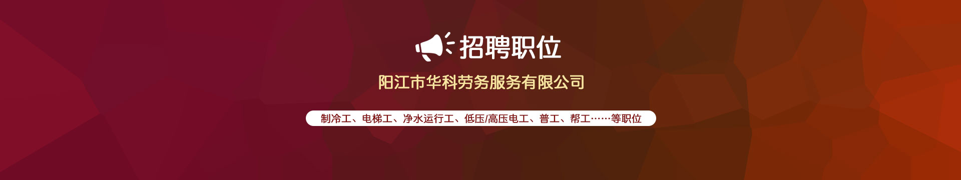 陽(yáng)江市華科勞務(wù)服務(wù)有限公司是專(zhuān)業(yè)從事勞務(wù)外包、人事代理、勞務(wù)租賃、人力派遣及管理的綜合性服務(wù)機(jī)構(gòu),是首批獲得廣東省人力資源廳、陽(yáng)江市勞動(dòng)和社會(huì)保障局頒發(fā)人力資源許可證的合法單位?!罢\(chéng)信務(wù)實(shí)、專(zhuān)業(yè)熱情、滿(mǎn)意第一、服務(wù)社群”的經(jīng)營(yíng)理念,在勞務(wù)派遣業(yè)務(wù)的基礎(chǔ)上,更致力于合同制工人(臨時(shí)工、實(shí)習(xí)生、假期工)方向發(fā)展,為用工企業(yè)及時(shí)輸送合格的各類(lèi)人才,合理調(diào)配人力資源的有序流動(dòng),幫助求職者尋求更加滿(mǎn)意的就業(yè)渠道和崗位,切實(shí)維護(hù)求職者的合法權(quán)益。